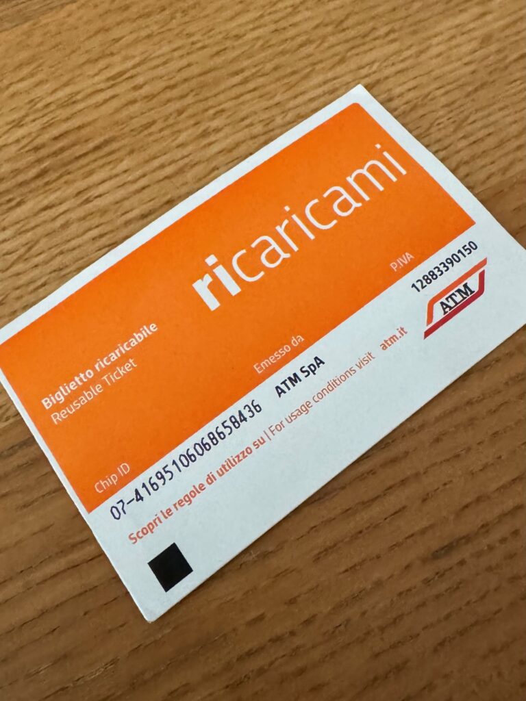 ミラノ到着後、リナーテで直ぐに購入しました。ミラノの公共交通機関で使う IC型の交通カード(チャージ式チケット)です。地下鉄、トラム、バスに乗れます。日数指定や回数指定をして地下鉄乗り場の自販機で購入。